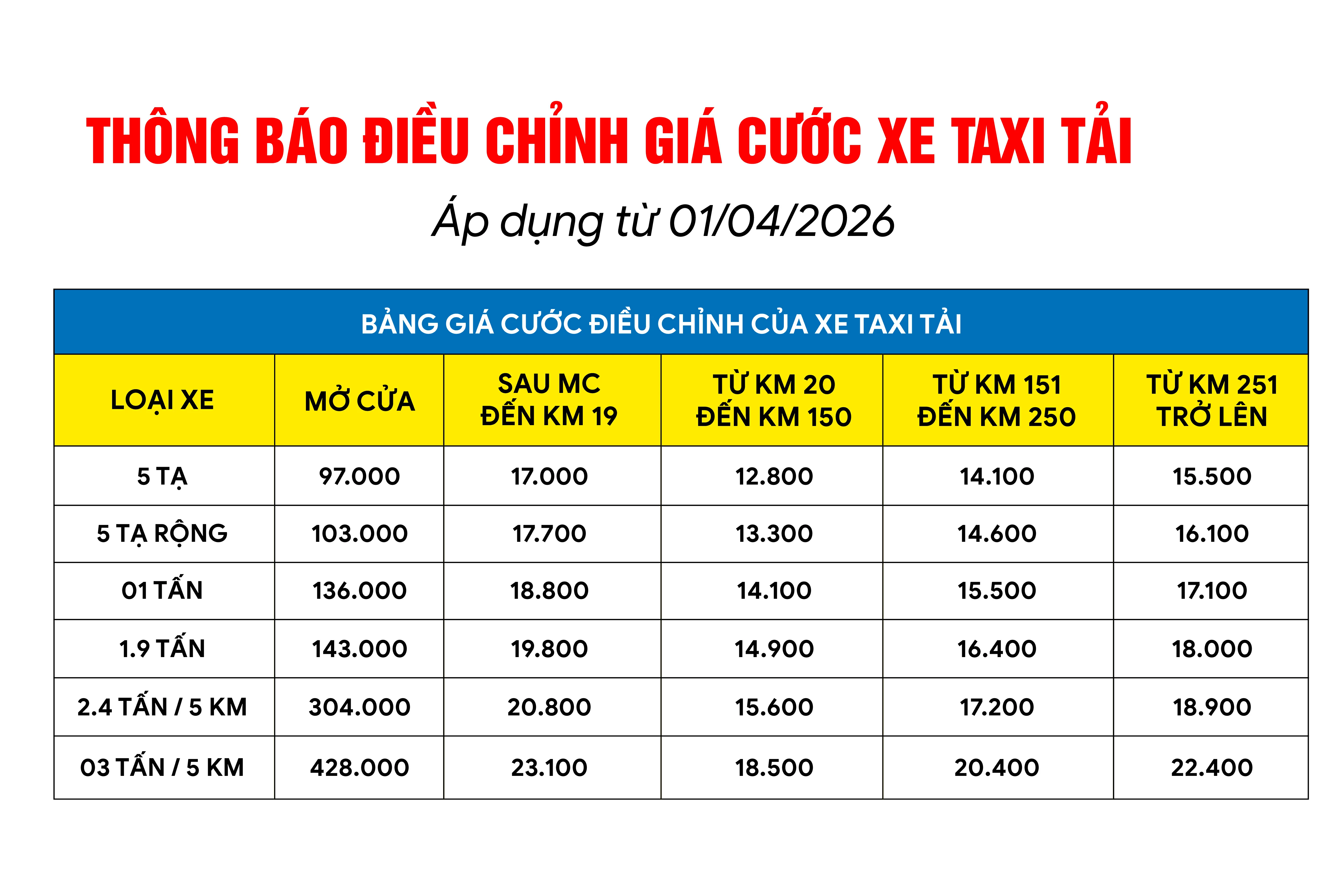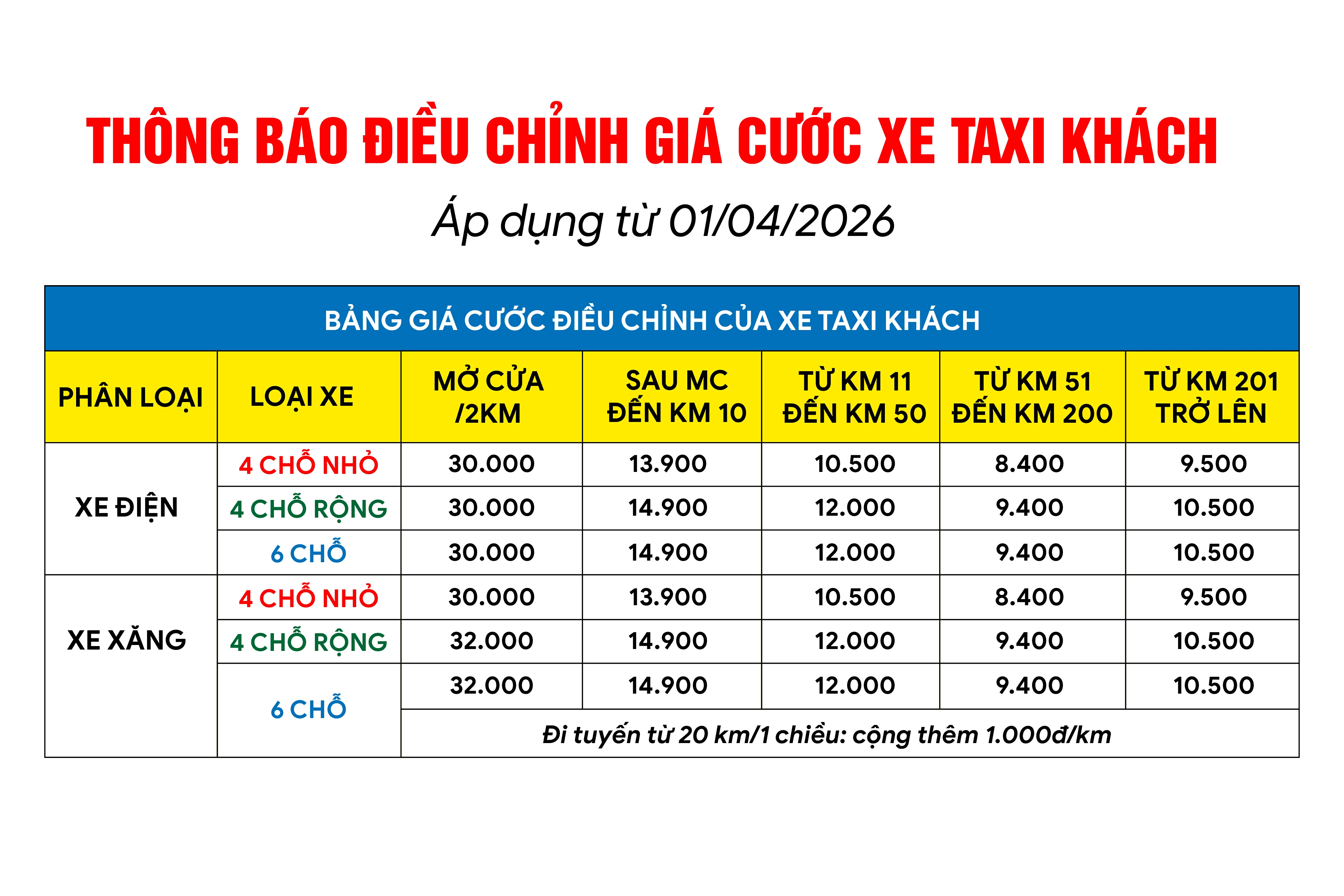 Nhằm đảm bảo chất lượng dịch vụ, cân đối chi phí vận hành trong bối cảnh thị trường có nhiều biến động, chúng tôi xin trân trọng thông báo về việc điều chỉnh giá cước đối với dịch vụ Taxi Khách và Taxi Tải, cụ thể như sau: